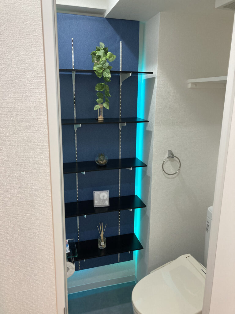 トイレは趣向をかえて、LEDライトを背景に仕込んだモダンなデザイン。